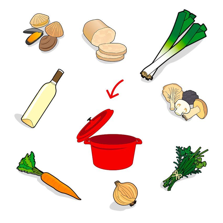 - Strain the bouillon and warm it up. In bowls or individual soup plates, spread the shitake mushrooms, the clams, the cubes of foie gras and a few leaves of coriander. Add some pepper with the grinder and pour the hot bouillon. Serve right away!
