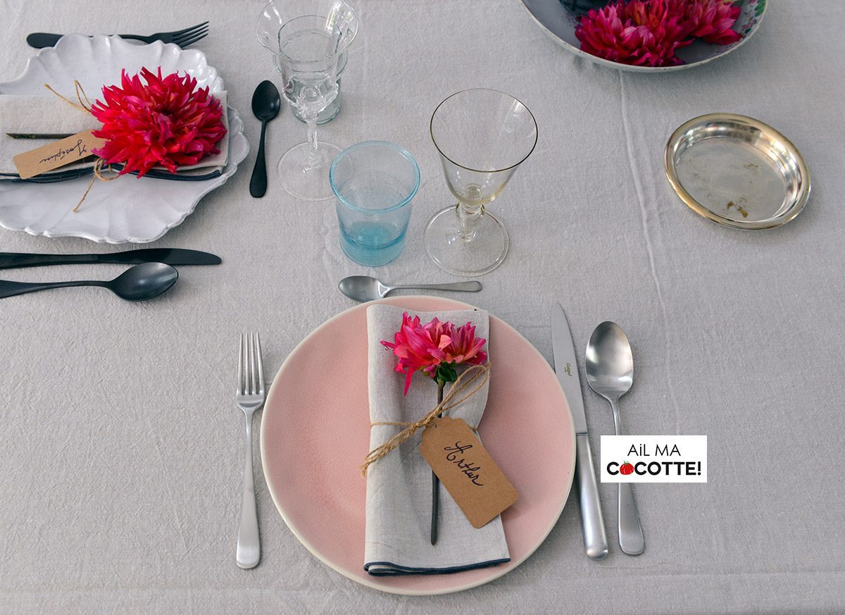- Pour la vaisselle, cela va être un peu compliqué et franchement très ennuyeux de vous lister tous les modèles… Je vous ai mis les photos de chaque assiette avec les noms des convives. Je vous suggère de m’envoyer un mail sur ailmacocotte@gmail.com si vous voulez des précisions sur l’une d’entre elles.